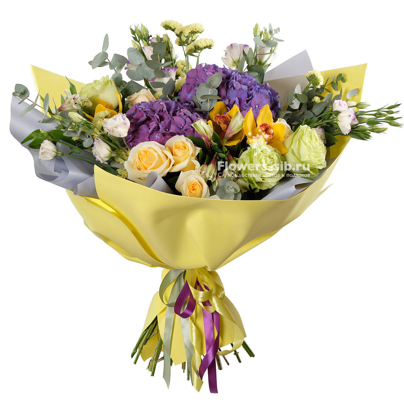 Гортензия - 2 шт. • Статица - 3 шт. • Эвкалипт - 4 шт. • Роза - 11 шт. • Эустома - 4 шт. • Орхидея - 3 шт. • Альстромерия - 3 шт. • Упаковка • Лента